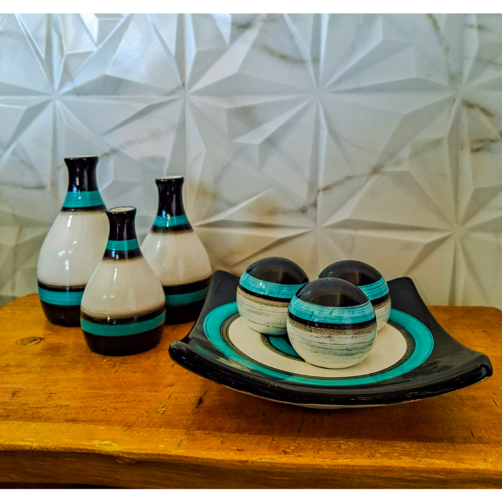 Kit Decoração Casa Centro de Mesa Trio Bojuda Prato com Esferas em Cerâmica