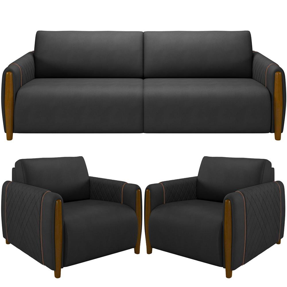 Kit Sofá 03 Lugares Sala Estar 223cm Com 02 Poltronas Flora Pés Madeira M03 Couríssimo Preto -