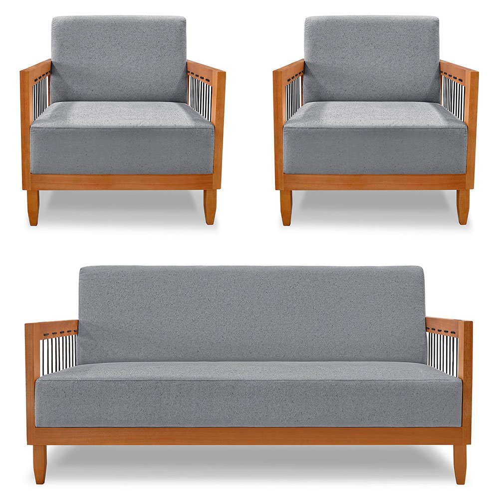 Kit 2 Poltronas e Sofá Living 2 Lugares Marilia 1,60m Linho Grafite Base em Madeira Castanho - Palla