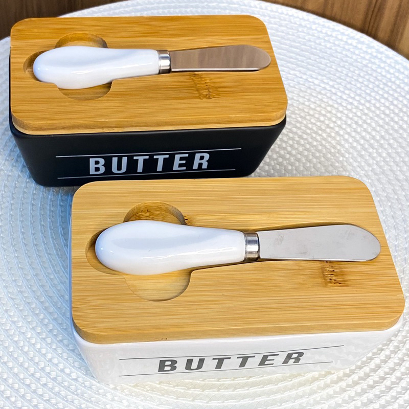 Manteigueira de Porcelana com Tampa de Bambu e Faca Preta ou Branca