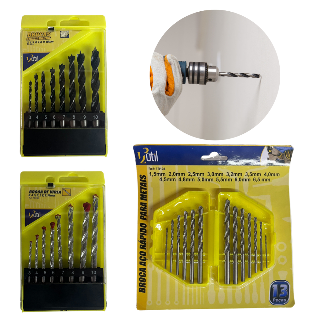 Kit Jogo de Brocas Aço Rapido Aço Carbono Videa 8 e 13 Peças Com Estojo Para Furar Madeira Metal Concreto