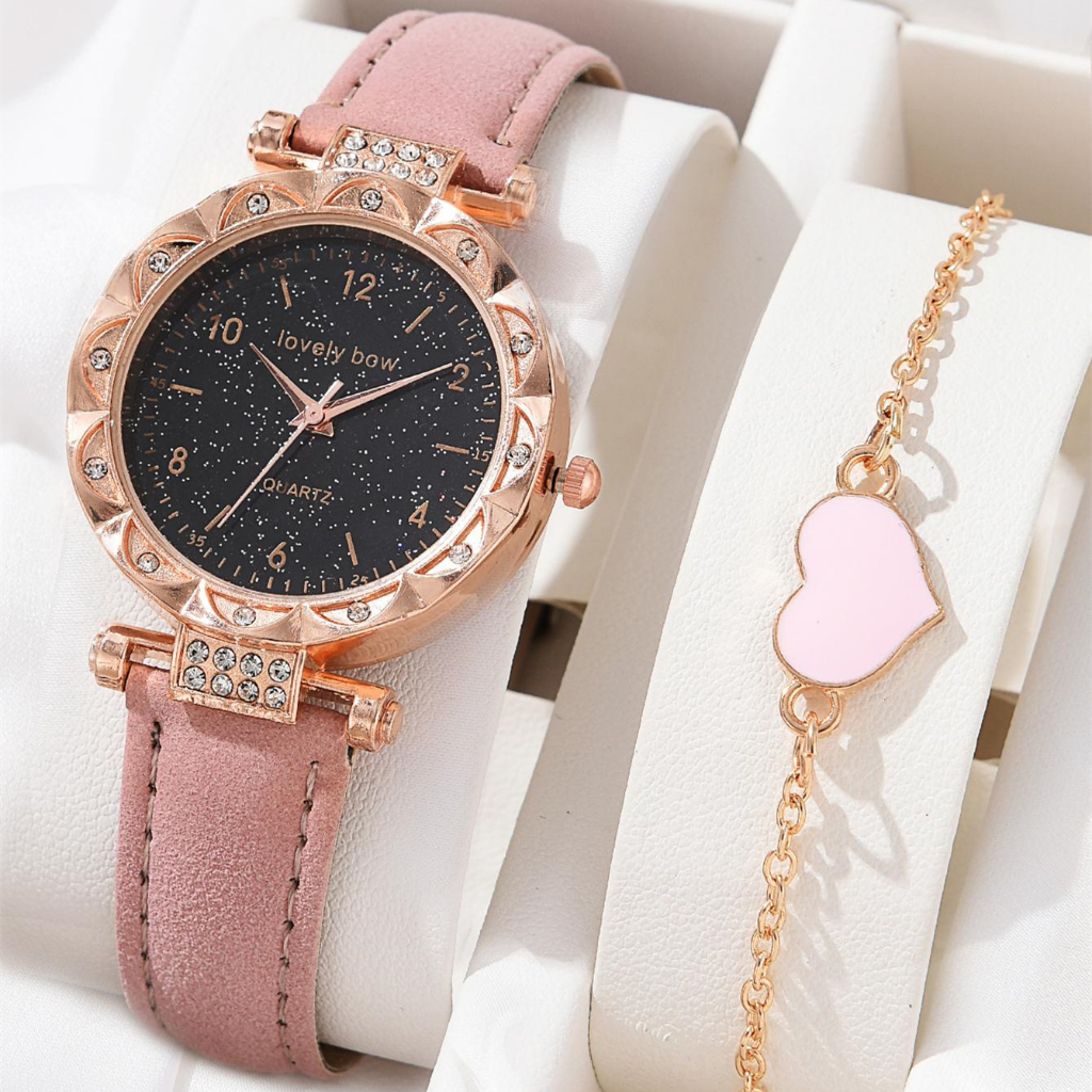 2 Pcs/Set Flower dial Em Forma De Flor Relógio De Couro Mulher Starry Sky Fashion Women Quartzo