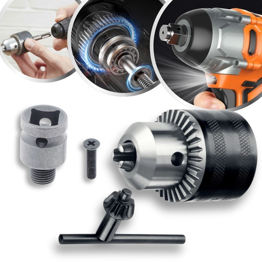 Kit Mandril com Chave 1/2 Rosca 1,5-13mm + Haste Adaptador de Parafusadeira de Impacto Universal Castanhas Reforçado Taladro Furadeira Martelete Pneumática Broca Makita Bosh Dewalt Stanley Hammer Wap Skill Titanium Dexter Deko Black & Decker Mondial Philc