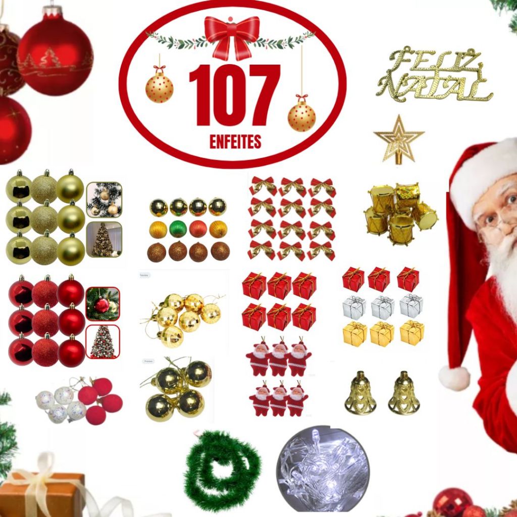 KIT 107 ENFEITES PARA DECORAÇÃO ARVORE DE NATAL - 106 ENFEITES + PISCA LED ***KIT COMPLETO NATAL