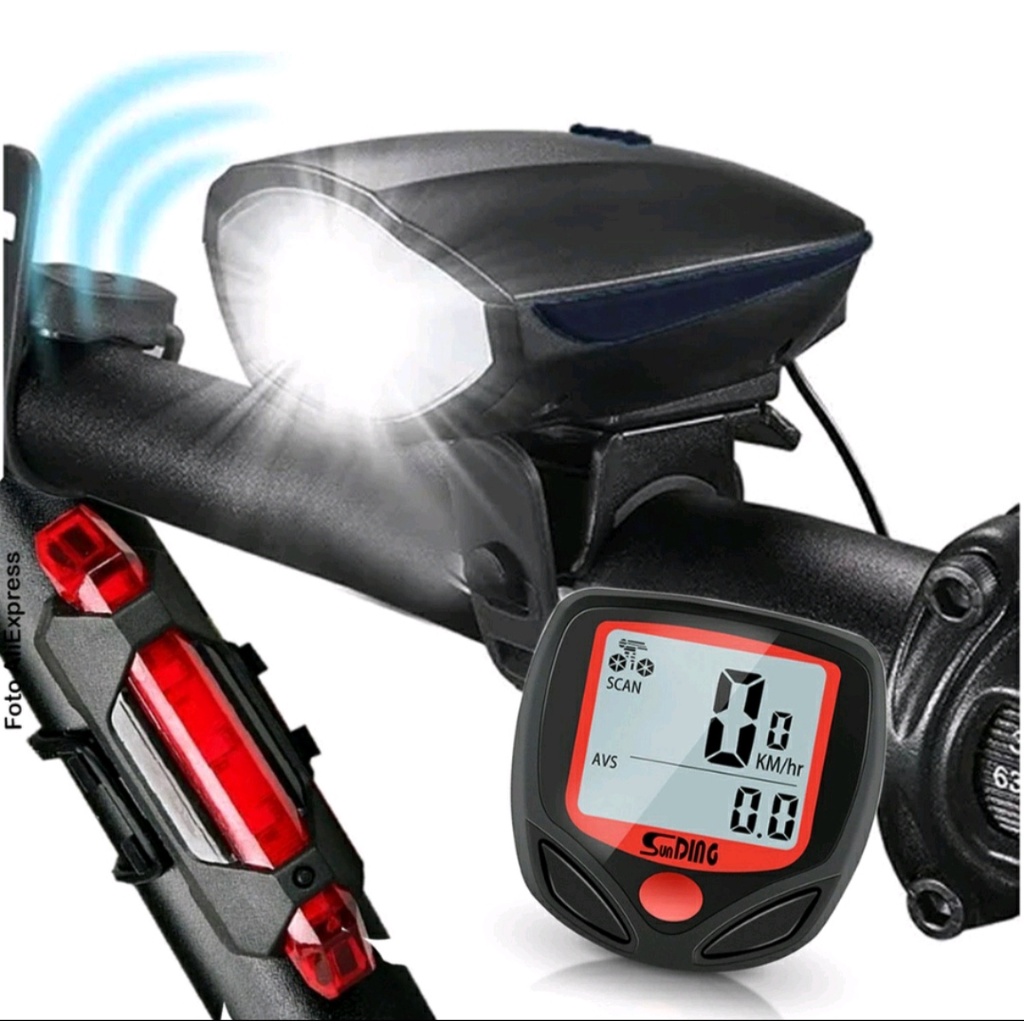 Kit de Acessórios para bike Farol + Sinalizador Traseiro + Velocímetro com Fio Bicicleta