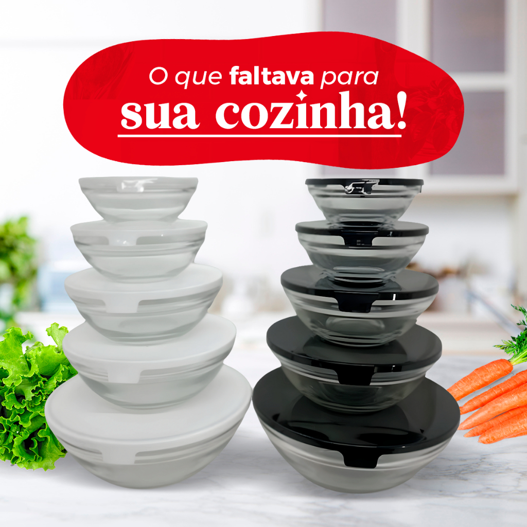 Conjunto Potes de Vidro C/ Tampa Kit 5 ou 3 Tigelas Redonda Hermético Organização Cozinha Alimento
