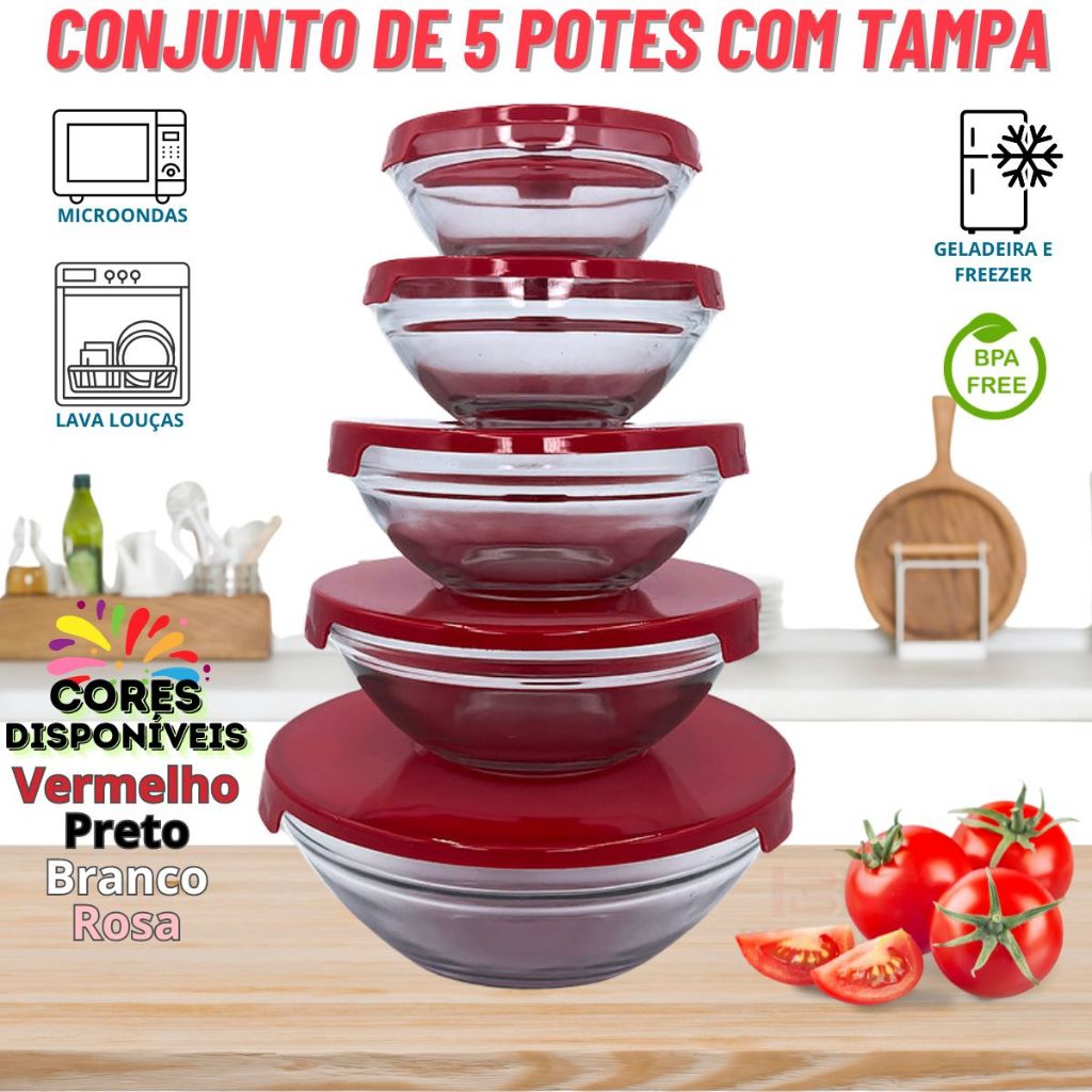 Conjunto Jogo Kit Potes Tigela Hermetico de Vidro com Tampa Marmita 5 Peças Porta Mantimentos Doces Papinhas