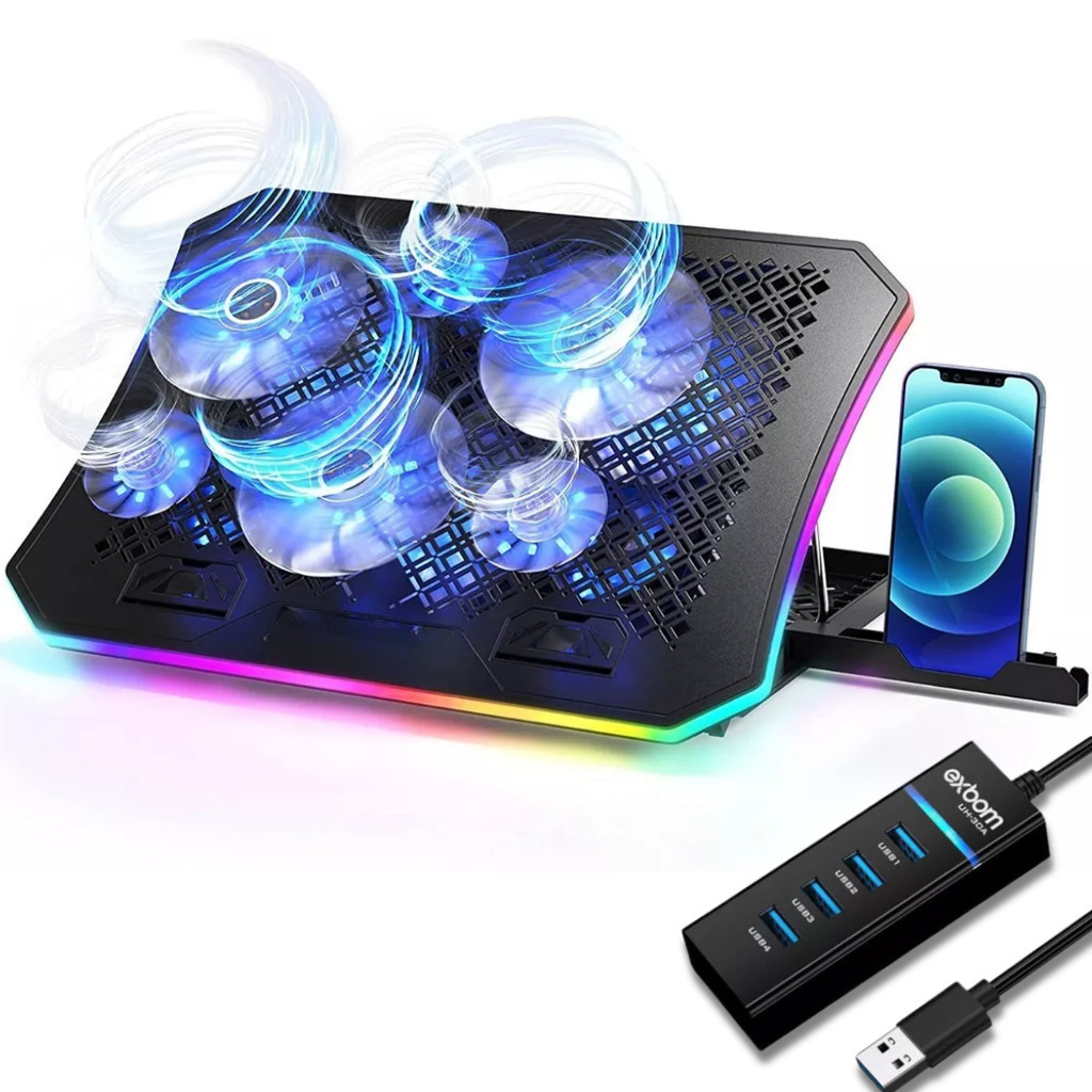 Base Cooler Notebook 17" 6 Fan RGB Suporte Celular Hub 3.0