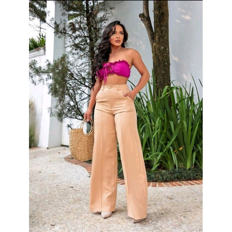 Calça Pantalona cintura alta tecido De Duna social estilo alfaiataria detalhe nas costa de elástico com zíper BOTÃO forrado no mesmo tecido - Várias Cores