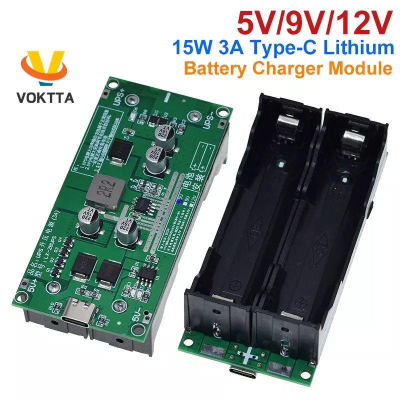 VOKTTA Tipo C 15W 3A 18650 Módulo Carregador De Bateria De Lítio DC-Booster Carga Rápida UPS Fonte De Alimentação/Conversor 5V 9V 12V