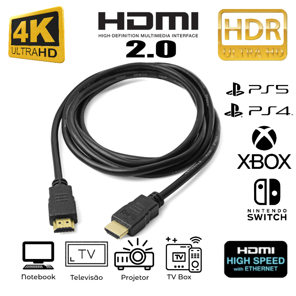 Cabo Hdmi HdTV Ultra Full Hd 4K 3D Alta definição Resolução Versão 2.0 2/3/5 Metros