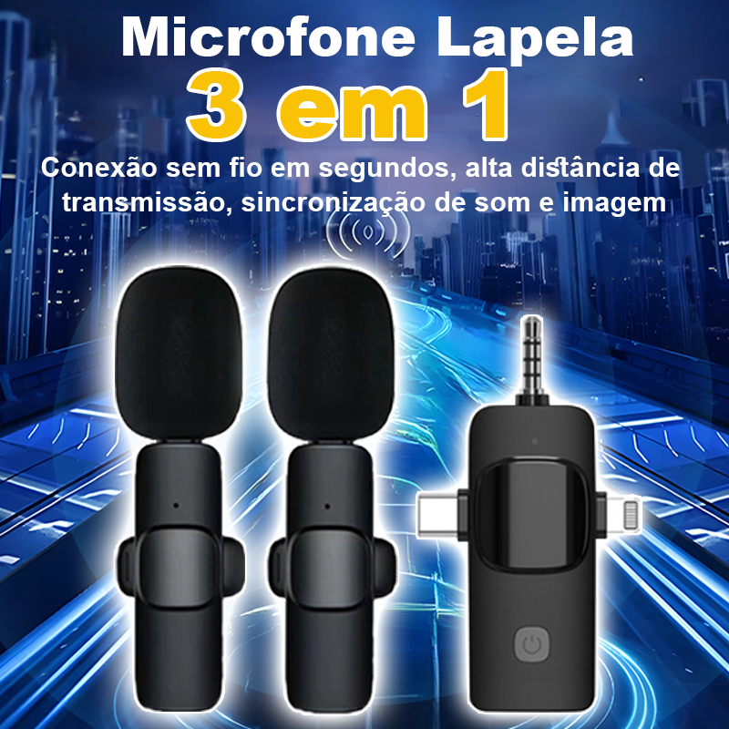Microfone de Lapela 3 em 1 Sem Fio, Compatível com Tipo C e iPhone, Ideal para Vlogs