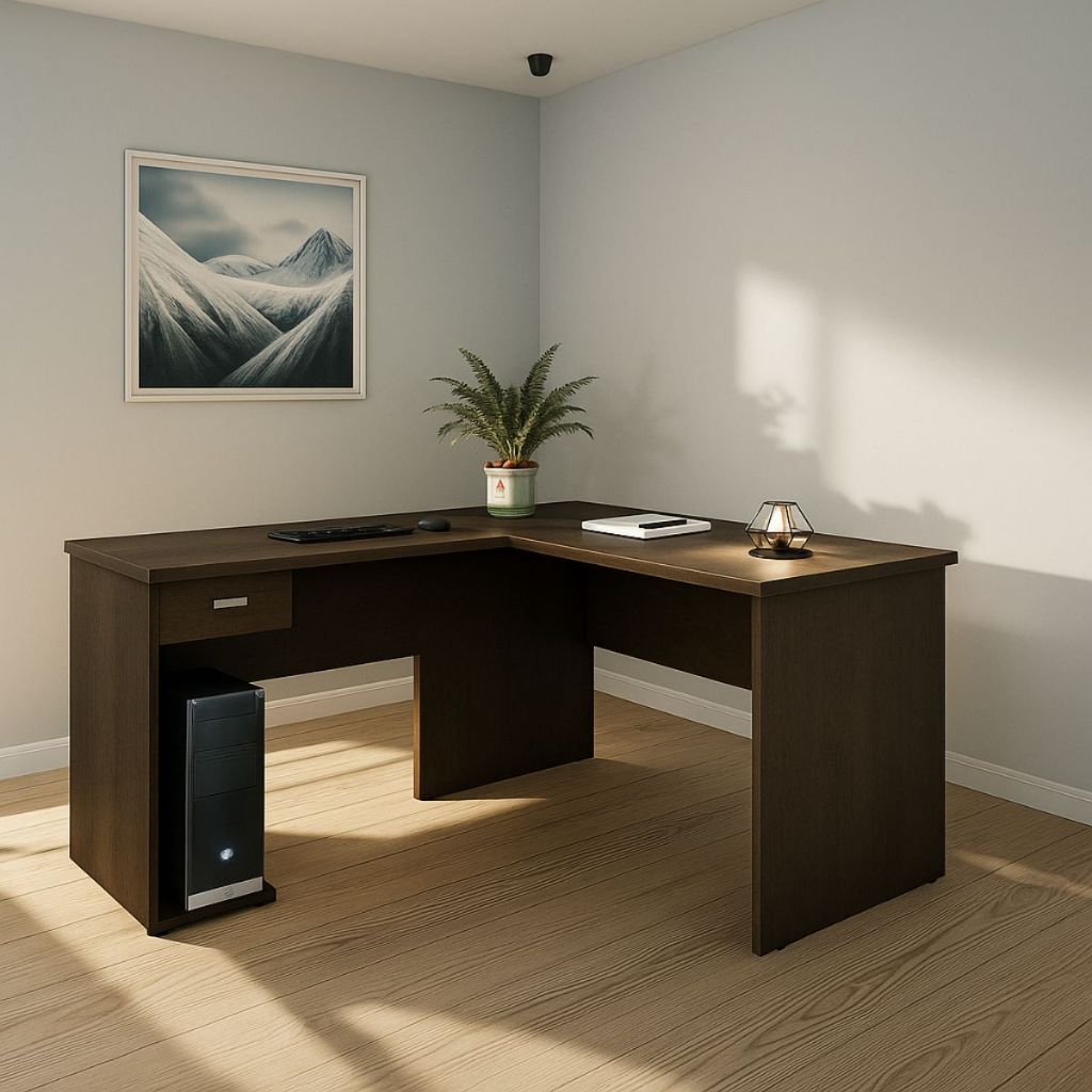 Escrivaninha Mesa de Canto em L Para Computador Home Office 1 Gaveta Escritório Marrom Amêndoa Preta