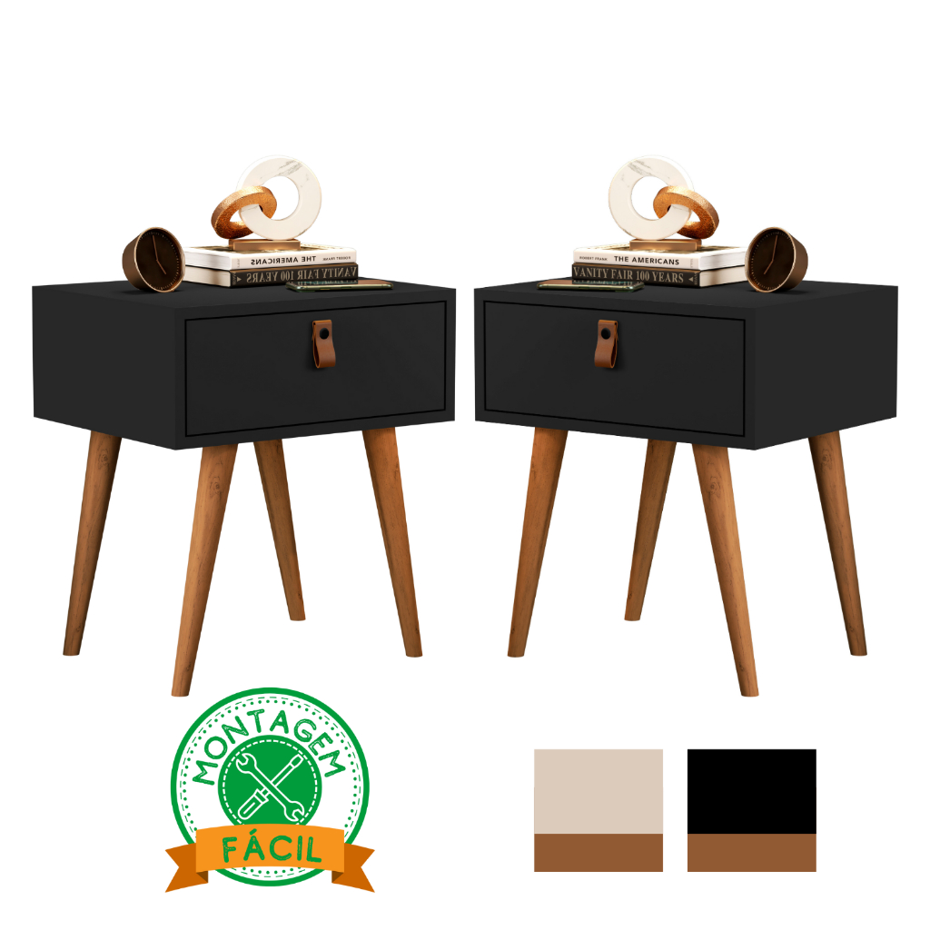 Kit 2 Mesa De Cabeceira Retrô Puxador em Couro Pés Madeira
