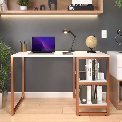 Mesa Escrivaninha Com 2 Prateleiras 1,20 Home Office Estudo Branco C/ Cobre