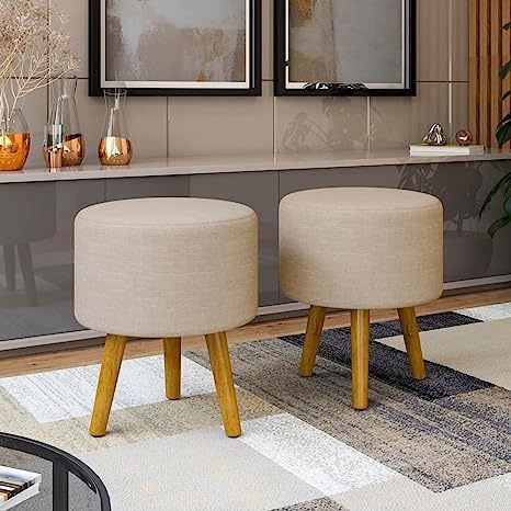Kit 2 Puff Banqueta Banquinho Redondo Em Linho Bege Thor Luxo Pés de Madeira