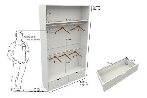 Armário Cabideiro Marina M16 100% Mdf Closet Gaveta Arara - Branco