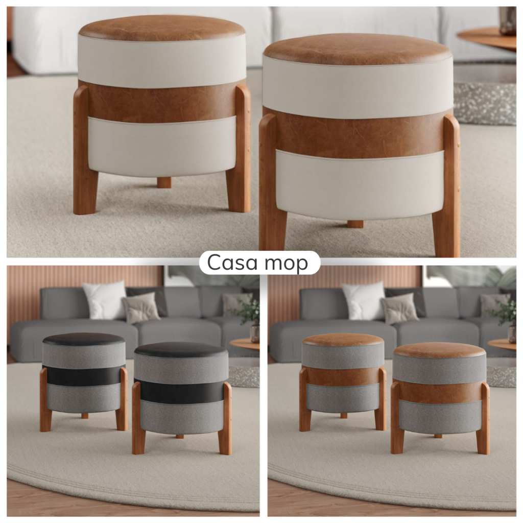 KIT-2 Puff robust em Couro e Linho Pés De Madeira Maciça