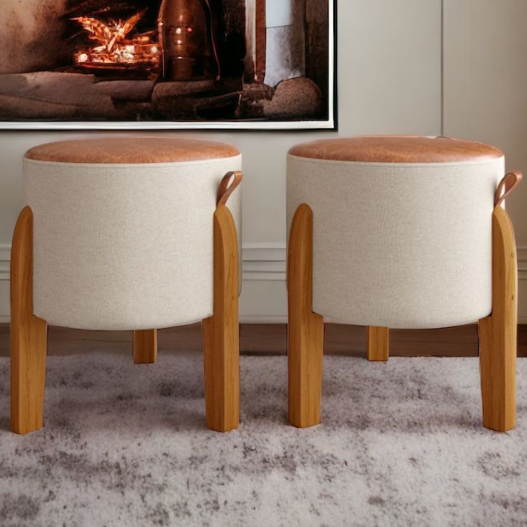 Kit 2 Banquetas Banco Puff Banquinho Assento Estofado Tecido Linho com Puxador Lateral em Couro e Pés Madeira Maciça Domos - Bege