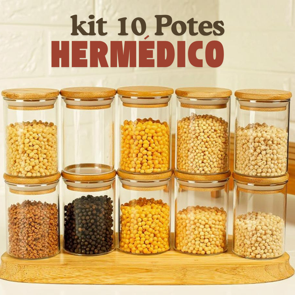 Kit 10 Potes de Vidro Hermético com Tampa de Bambu 250ml para Temperos e Alimentos