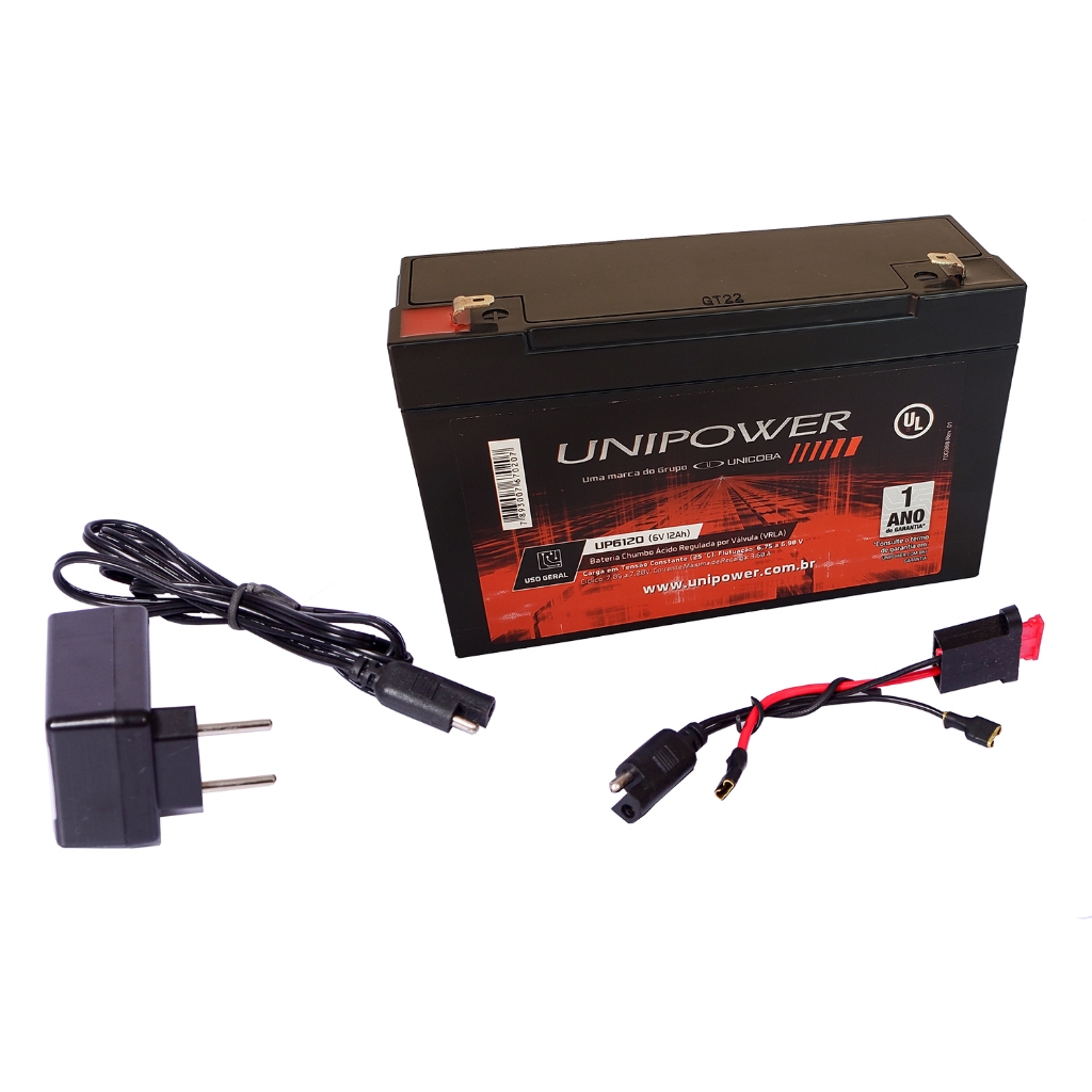 Kit Bateria Selada Unipower 6V 12Ah VRLA + Carregador 6V+ Chicote - Sistemas de Alarme e Segurança, Brinquedos e Jogos Eletrônicos, Sistemas de Energia Solar, Iluminação de Emergência, Sistemas de Controle de Portões Automáticos