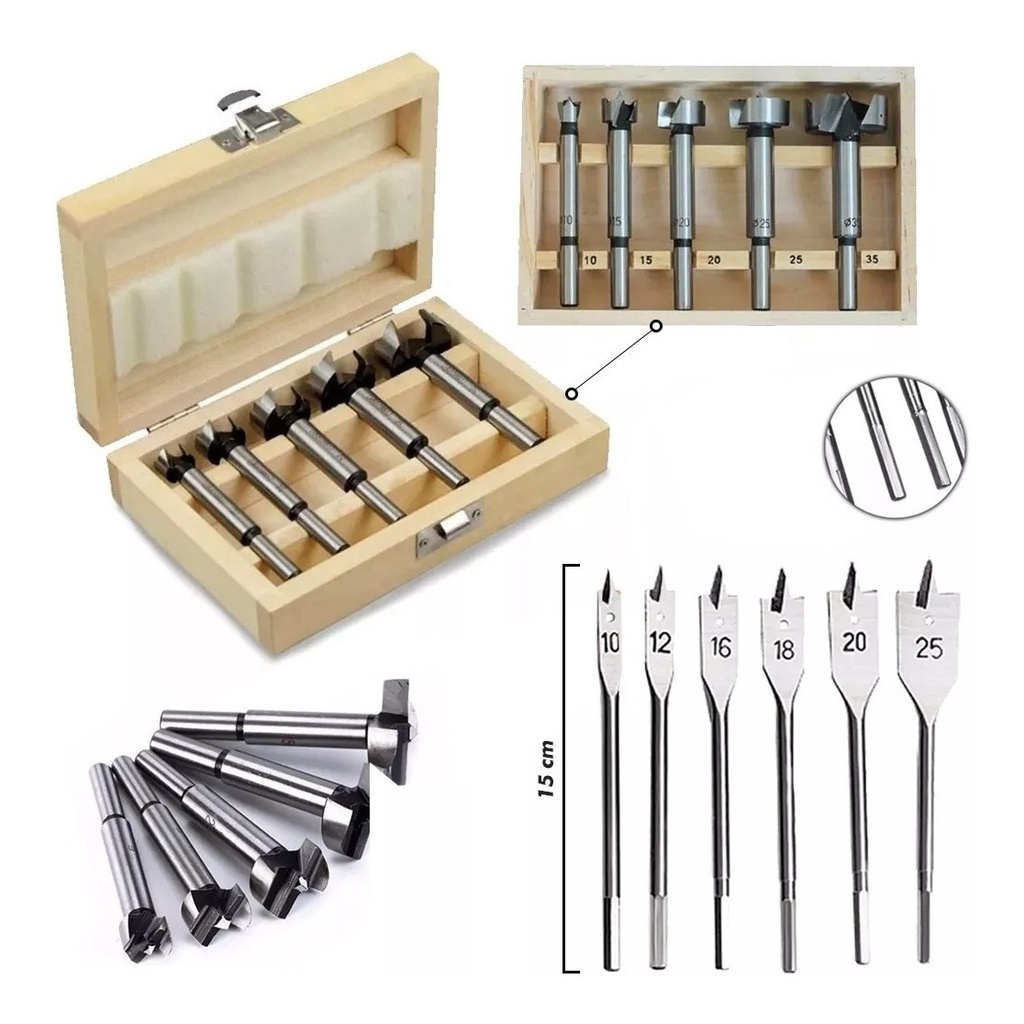 Jogo Kit 5 Brocas Fresas Forstner 10-35mm + Jogo Broca Chata