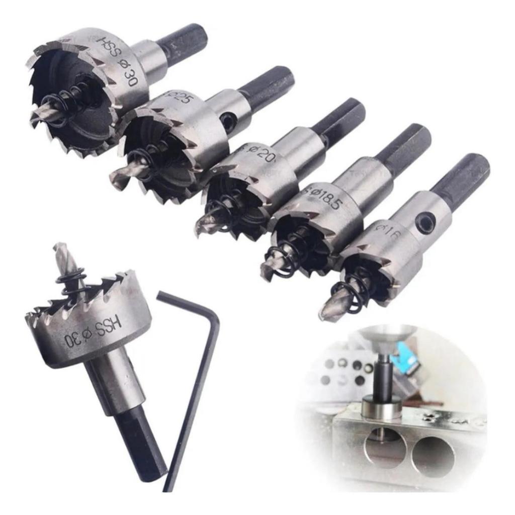 Jogo Brocas 5 Serra Copo Metal Escovado 16 18.5 20 25 E 30mm