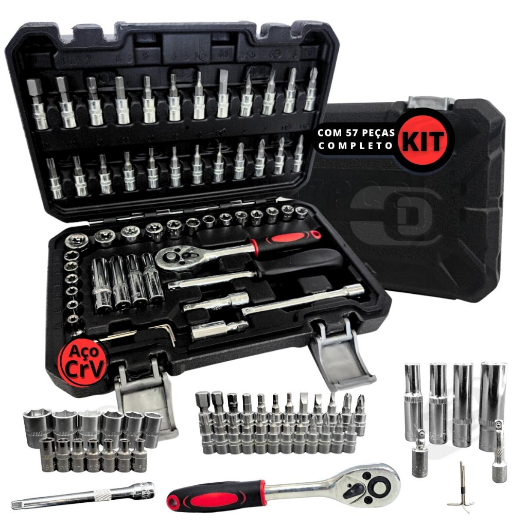 Jogo De Soquete Kit 57 Peças 1/4 Catraca Ferramenta e Malata Reversível Açõ Crv