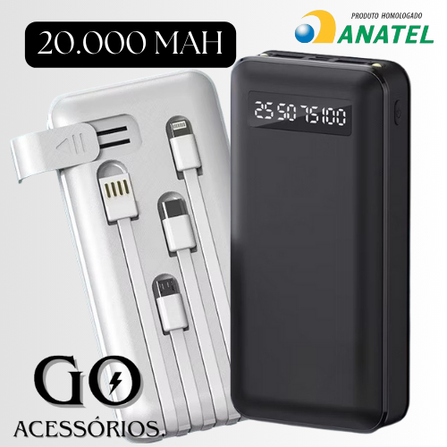 Carregador Portátil 20000mAH Power Bank Com 4 Tipos De Cabo (Lightning, TIPO -C, V8, USB) Com Visor