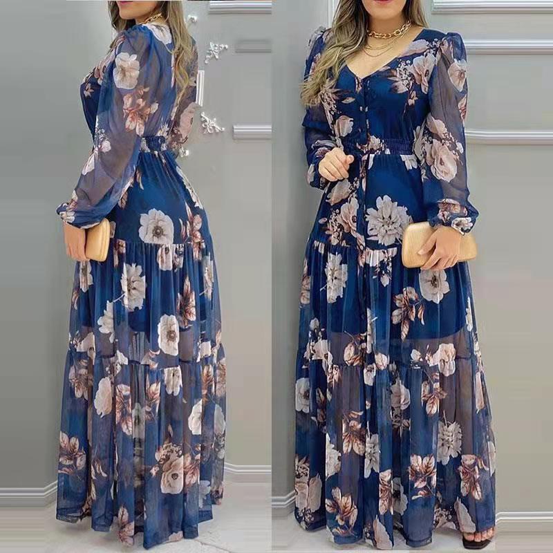 Vestido de chiffon com decote em V alfaiataria estampado floral longo elegante verão festa casamento réveillon banquete moda (2203)