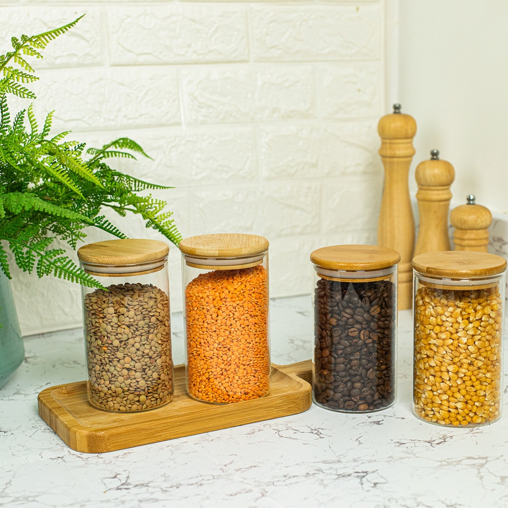 Pote De Vidro com Tampa De Bambu Kit 4un Porta Mantimento Vedação Hermética 450ml 4pcs