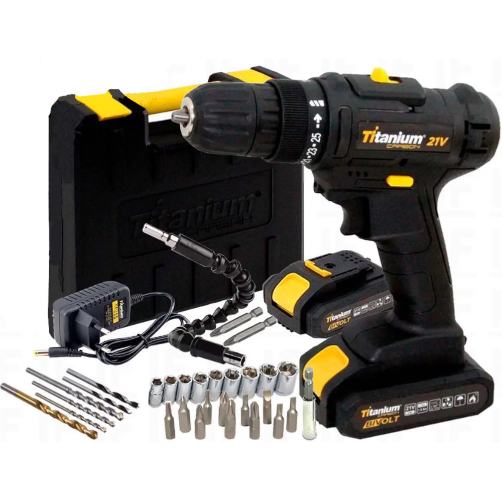 Furadeira Parafusadeira de impacto 3/8" a bateria 21V com 2 baterias e 35 acessórios Carbon - Titanium
