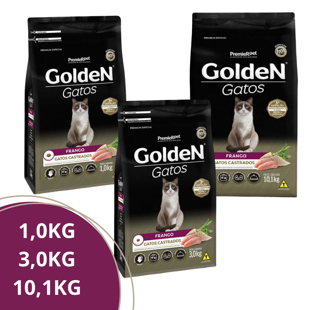 Ração Golden Gatos Adultos Castrados Sabor Frango (1kg, 3kg, ou 10,1kg) - Golden Premier