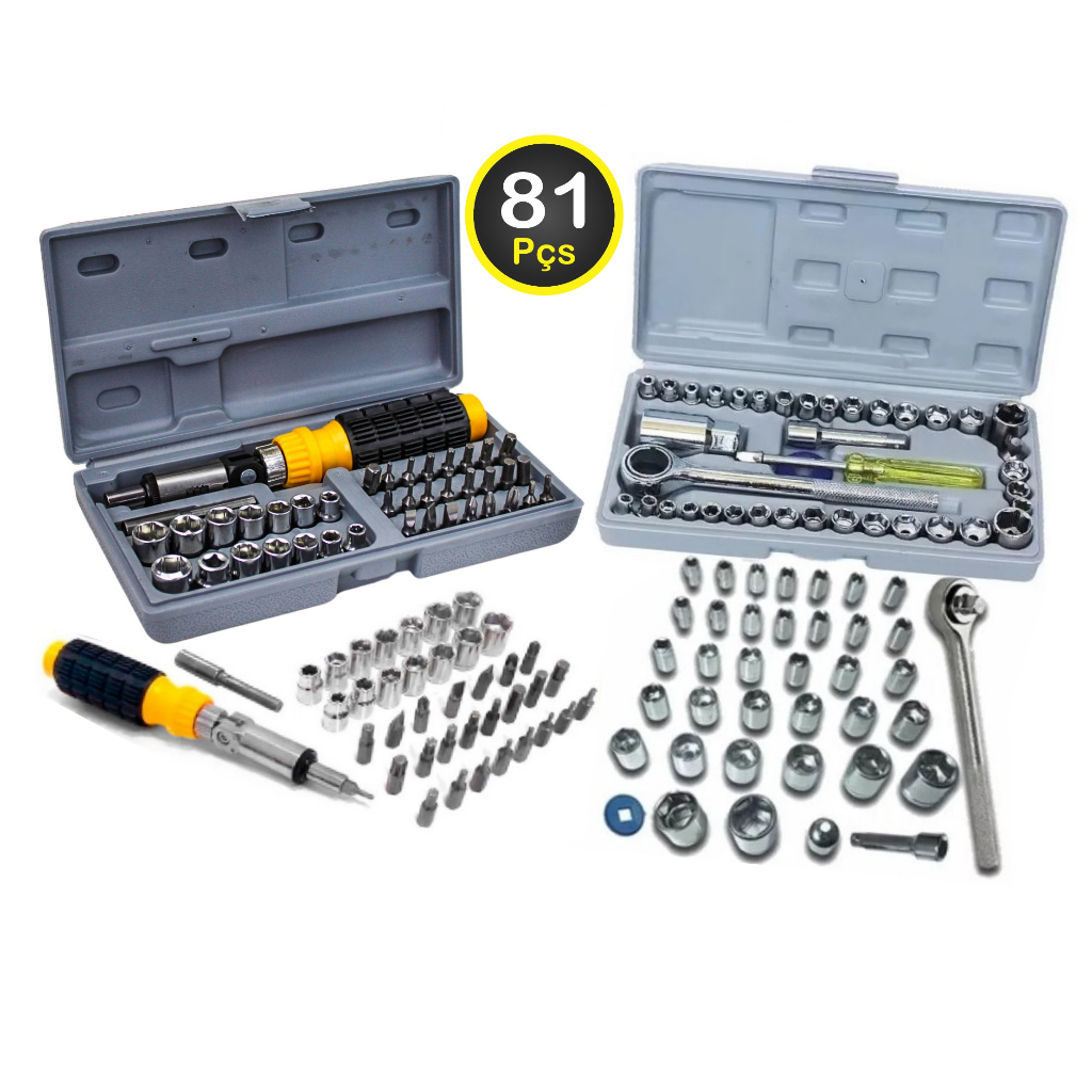 Kit Jogo de Ferramentas Chave Catraca Reversível Soquetes Bits 81 Peças