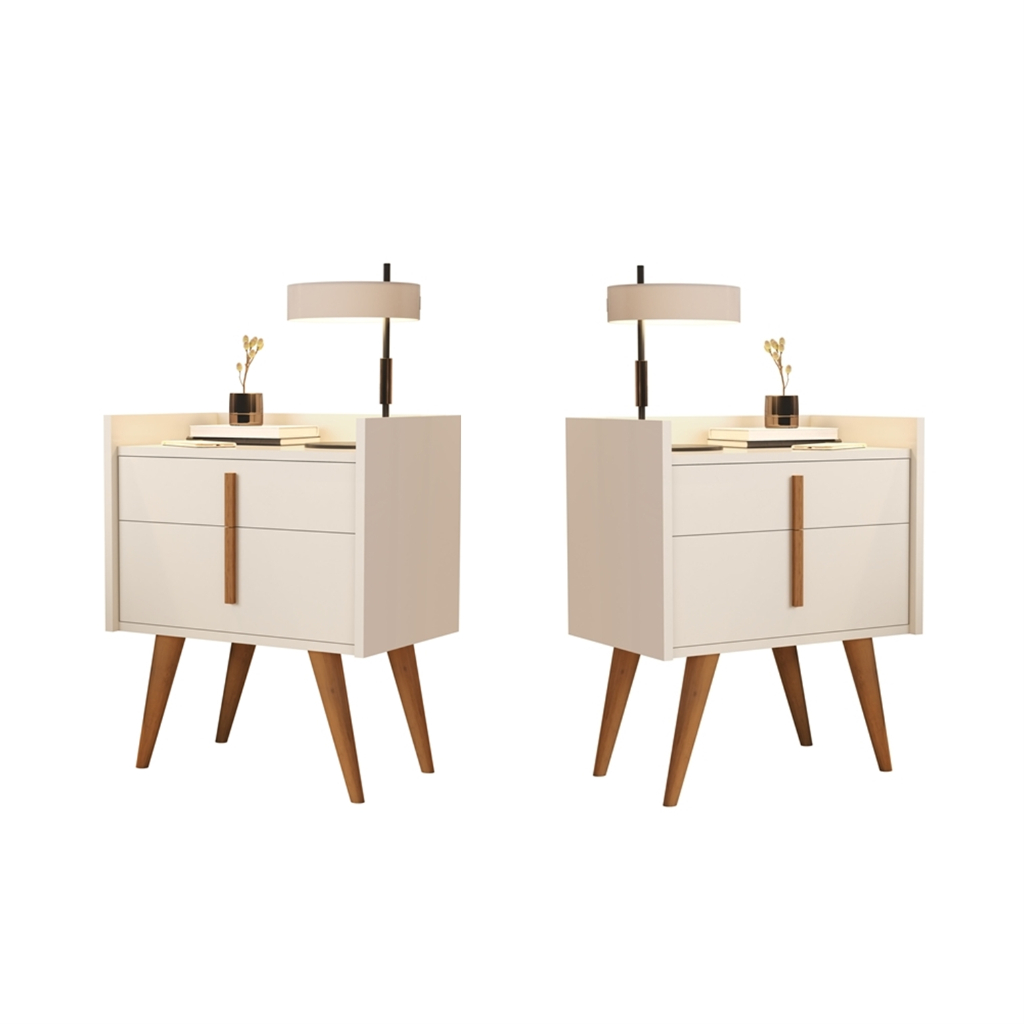 Kit Duas Mesas De Cabeceira Retrô Pés Palito Em Madeira Maciça 2 Gavetas E 1 Nicho - Verona - Off White Com Nature - Lojas GD