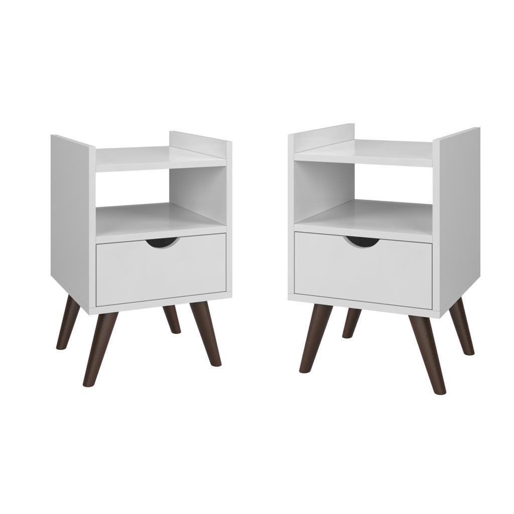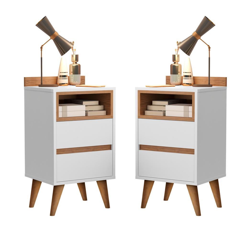 kit Mesas De Cabeceira Retrô Pés Palito Em Madeira Maciça 2 Gavetas e 1 Nicho - Pop - Branco