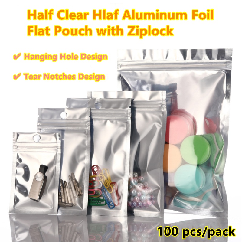 100 Unidades Saco De Alumínio Brilhante Translúcido Com Visor Zip Resealable Armazenamento Embalagem Para Presente De Cosméticos
