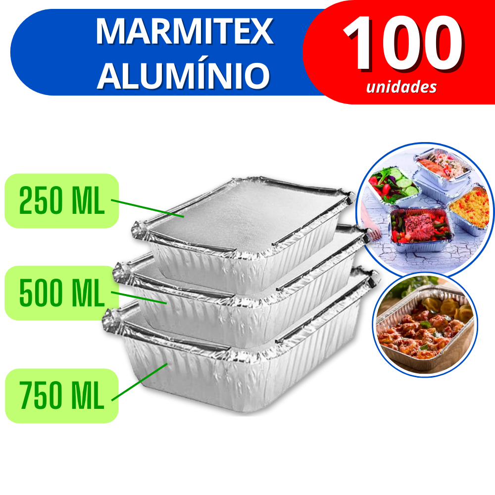 Embalagem marmitex em alumínio microondas, forno e freezer - 100 unidades (250ml / 500ml / 750ml)