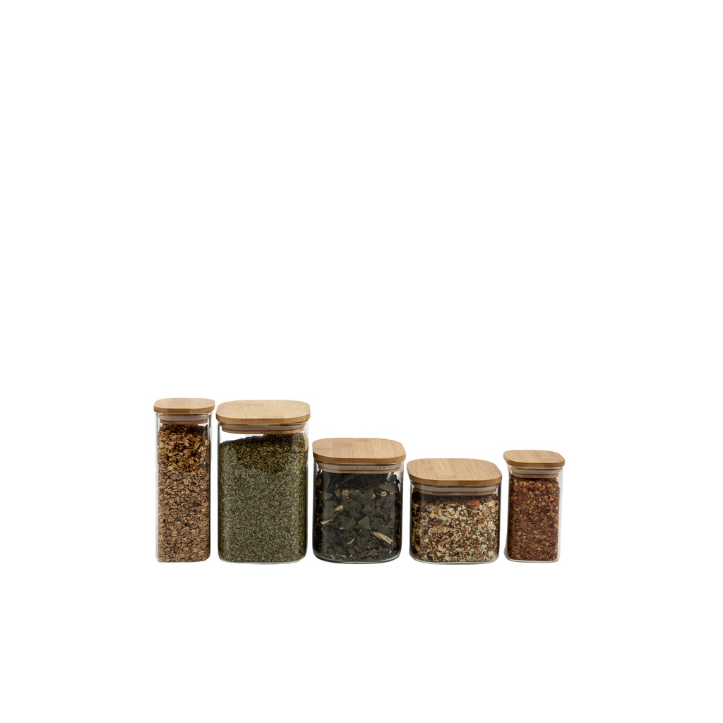 Kit 5 potes de vidro com tampa de bambu herméticos empilháveis quadrados - Oikos
