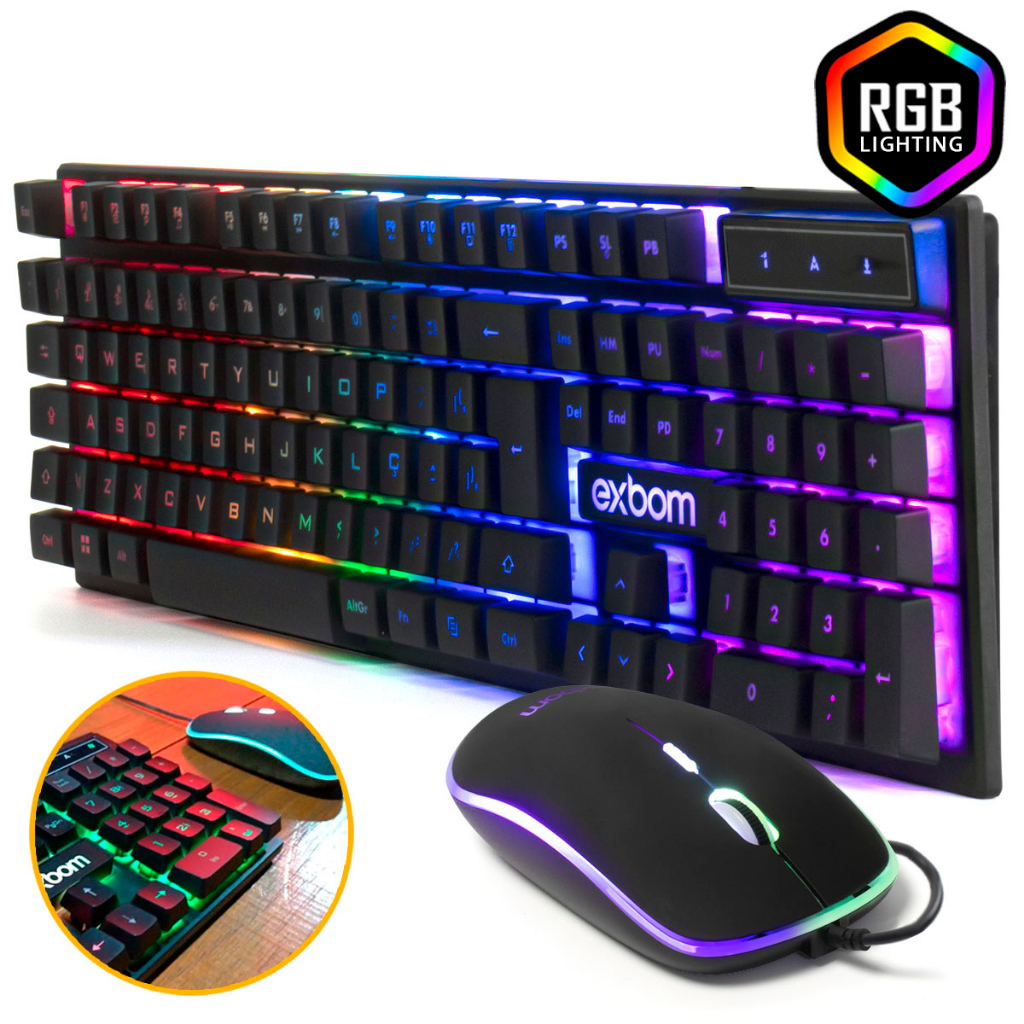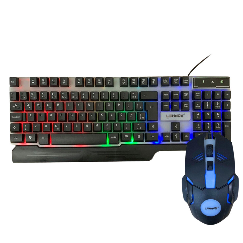 Kit Teclado e Mouse Gamer Semimecânico ABNT2 Led RBG Luz Colorida 2400 DPI Com Fio USB
