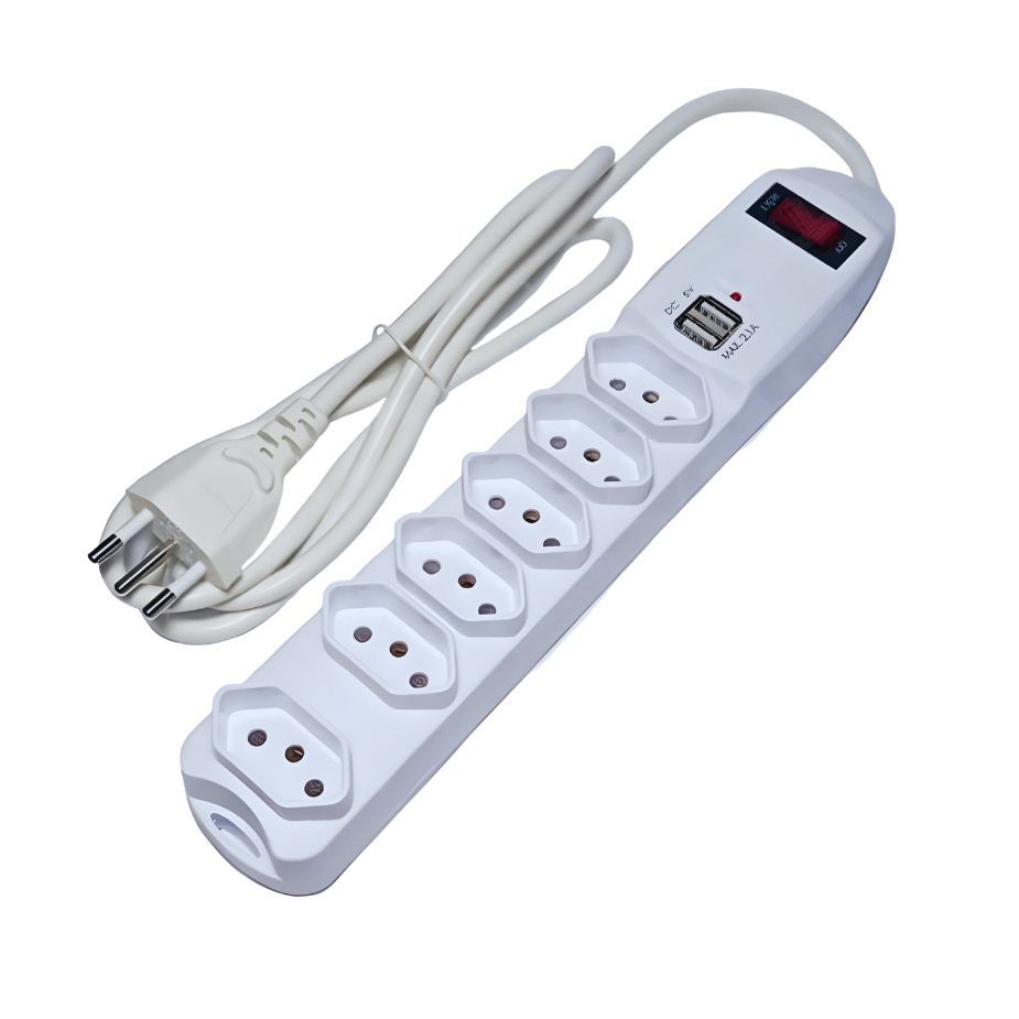 Filtro de linha Régua com botão desliga e liga, 2 USB carregador ultra rápido, 6 tomadas tripolar
