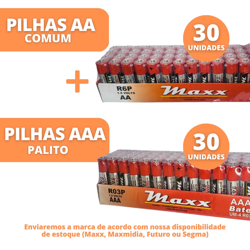 30 Pilhas AAA Palito + 30 Pilhas AA Comum Combo de Pilhas 60 uni