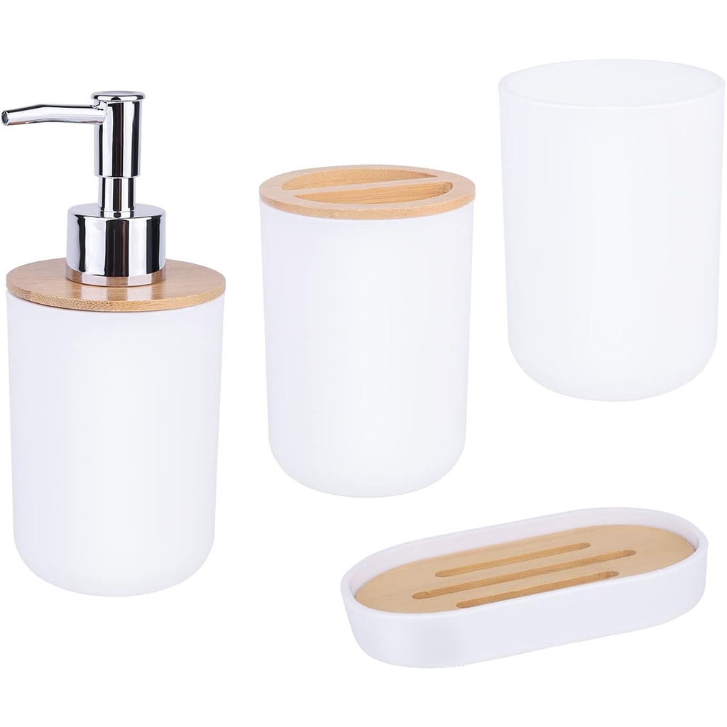 Modus Conjunto Para Banheiro Dispenser Branco Kit 4 Sabonete Liquido Porta Algodão E Escova Com Bandeja De Bambu Hire Bold
