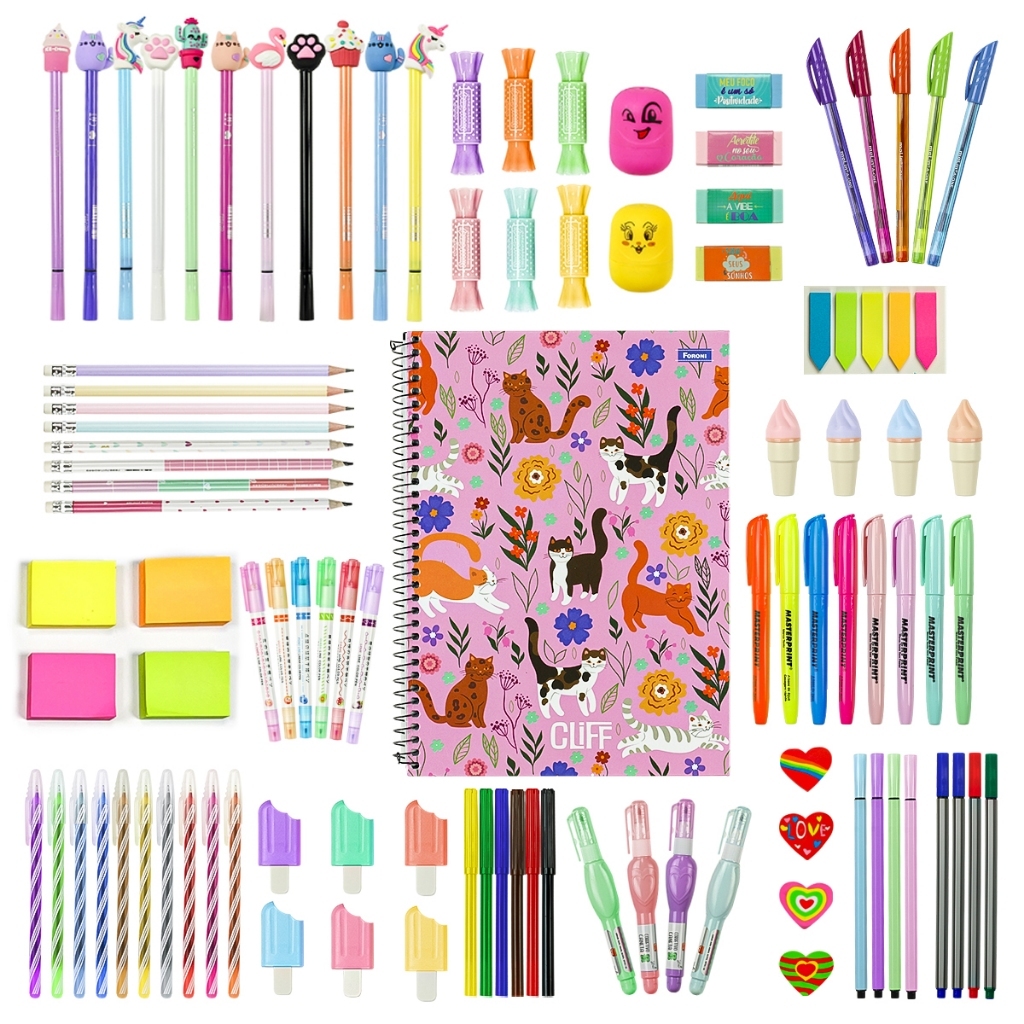 Kit Papelaria Fofa Kawaii caixa com 15 Itens Presente Criativo Marca texto canetas fofas estojo caderno adesivos post it