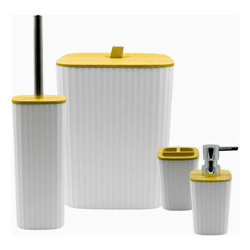 Kit 4 Peças Banheiro Lavabo Jogo Conjunto Bambu Lixeira Dispenser Multiuso Porta Escova Pasta Dente Combinar Reforçado Elegante Luxo