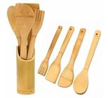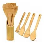 Kit Com 4 Peças e Suporte Talher Bambu Garfo Colher Espatula