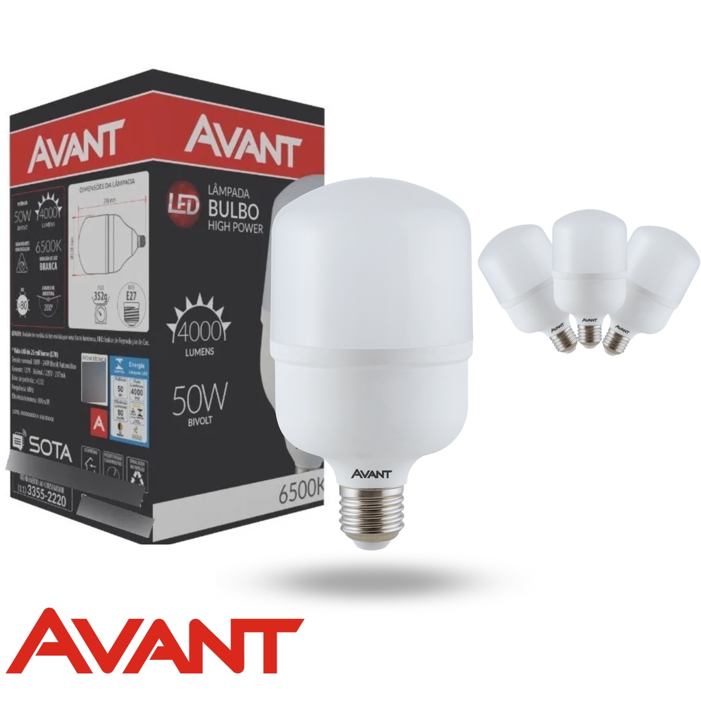 Kit 03 Lâmpadas Led Bulbo 50w Alta Potência E27 Bivolt 6500K Branco Frio Avant ORIGINAL (1 Ano de Garantia)