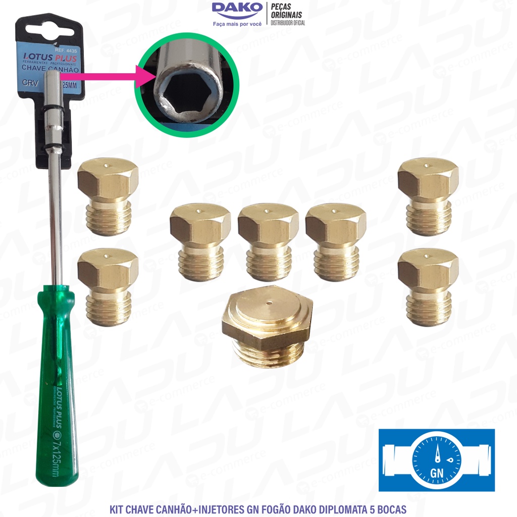 KIT 01 CHAVE CANHÃO + 08 INJETORES GÁS GN PARA FOGÃO DAKO DIPLOMATA 5 BOCAS 100% ORIGINAIS DE FÁBRICA