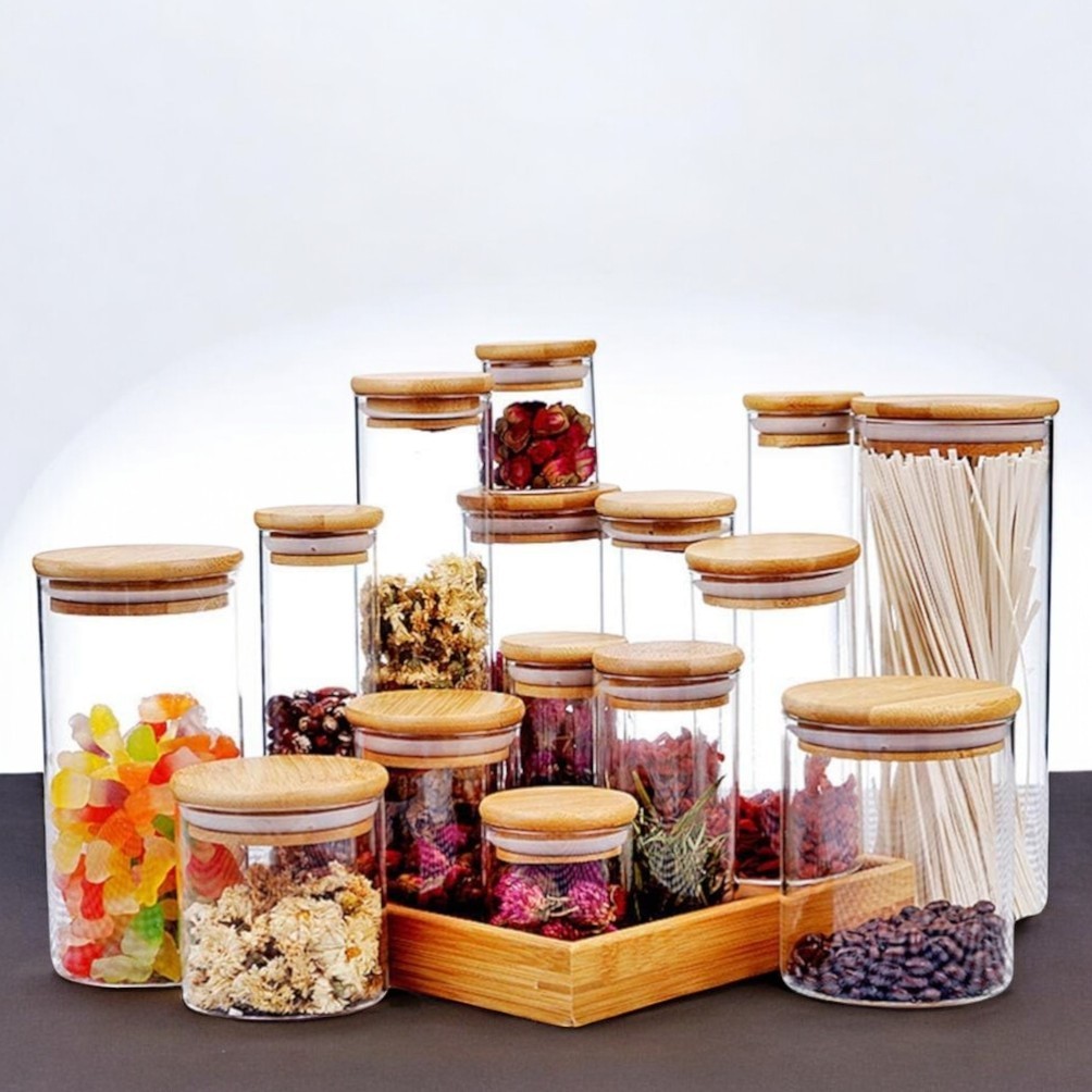 Kit 11 potes de vidro com tampa de bambu herméticos - Tüd