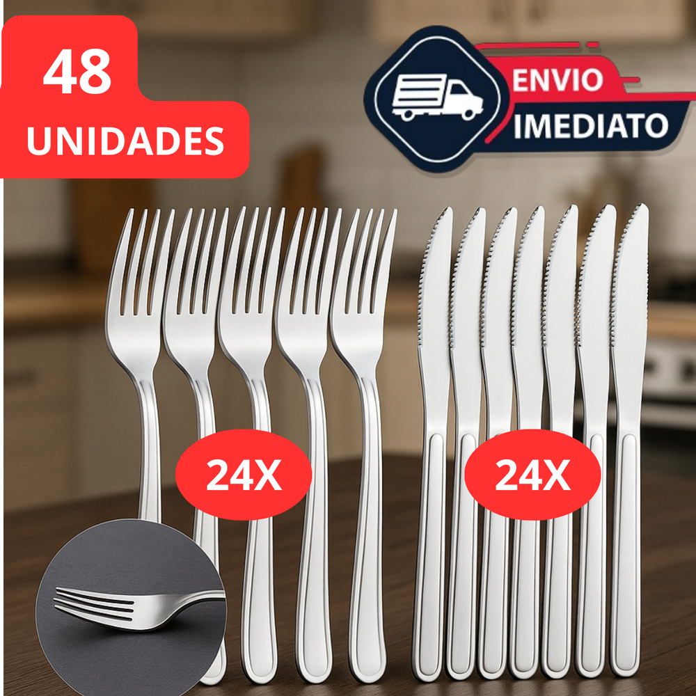 Kit 48 Talheres em Aço Inox – 24 Facas, 24 Garfos para Cozinha, Churrasco, Restaurante ou Buffet